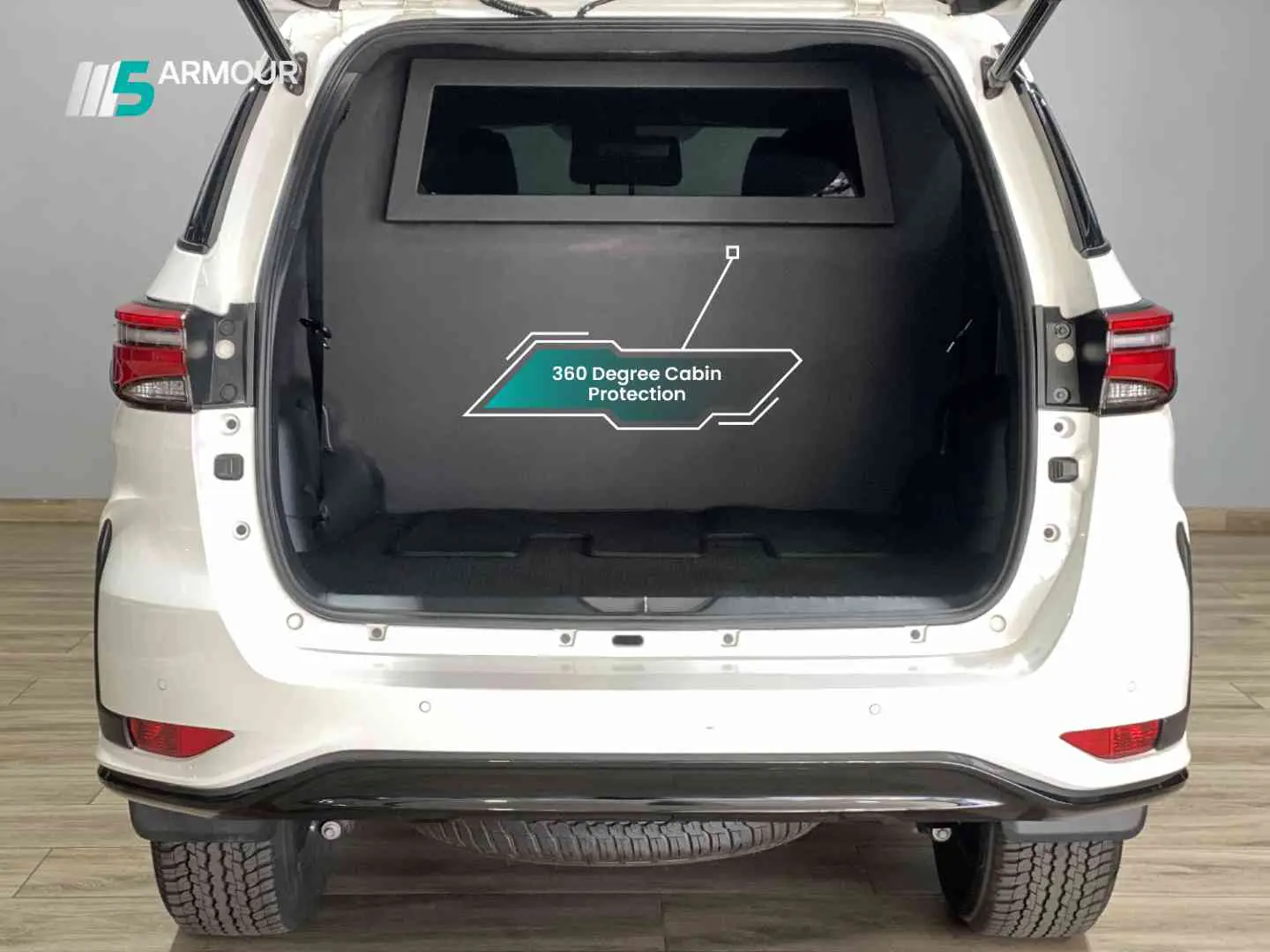 5.5mm Armox Advanced ballistic steel reinforcing the firewall, A-, B-, and C-pillars, roof, rear side headers, and rear panel