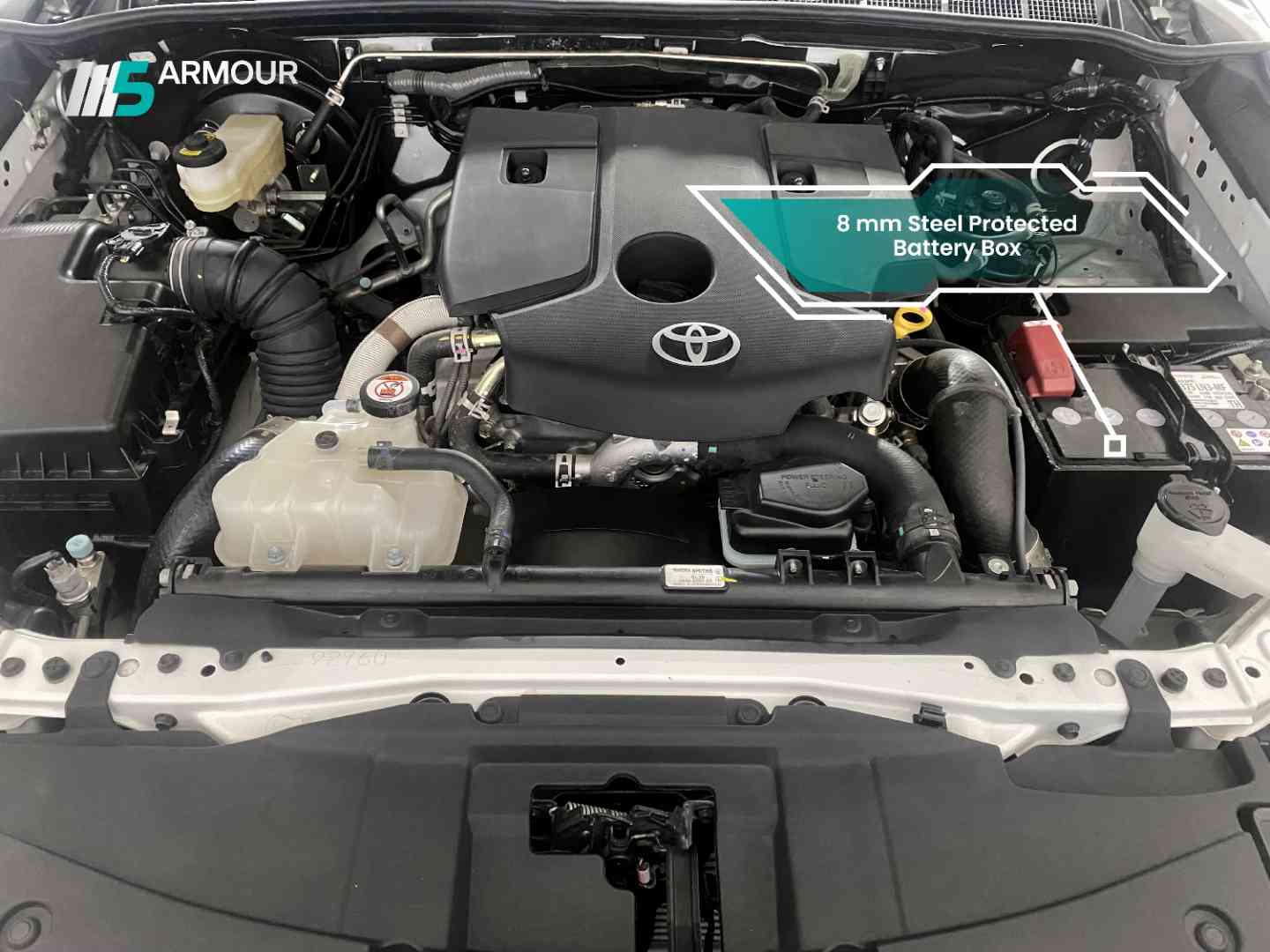 A ballistic steel-protected battery box using the same 5.5mm Armox steel